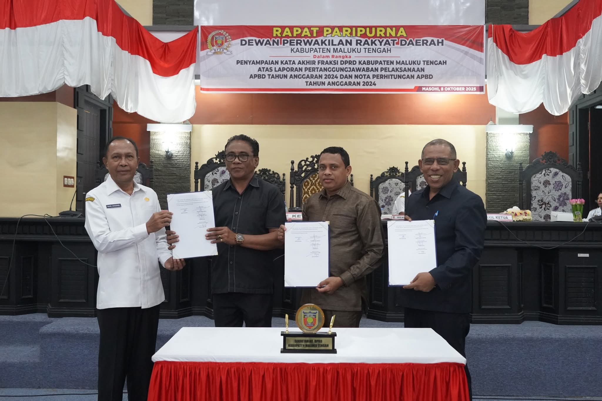 Paripurna Parlemen Rakyat negeri Pamahanu-Nusa dengan agenda penyampaian kata akhir fraksi atas Laporan Pertanggungjawaban Pelaksanaan APBD Tahun Anggaran 2024 serta Nota Perhitungan APBD Tahun Anggaran 2024 berjalan hikmat. Agenda rutin itu berjalan di ruang rapat utama kantor DPRD Malteng